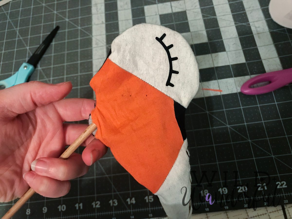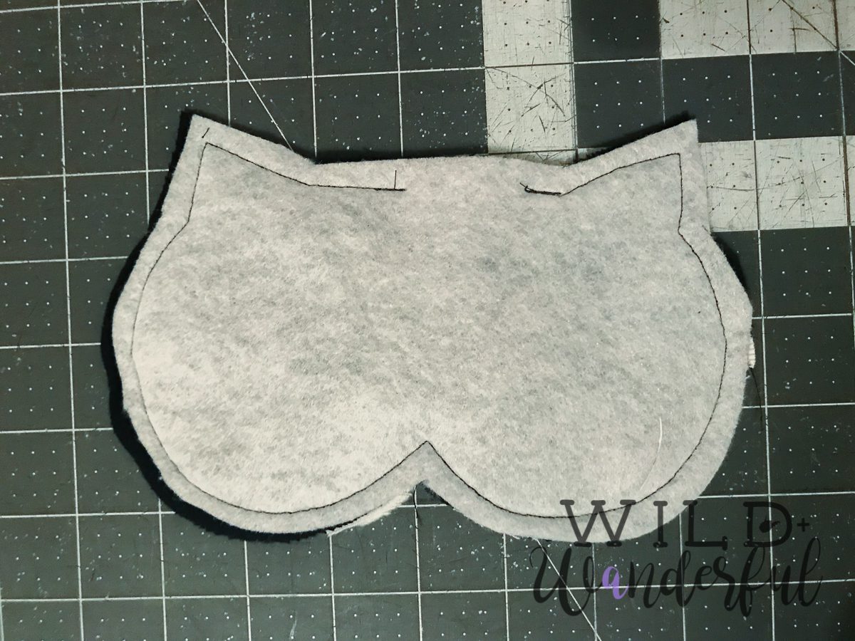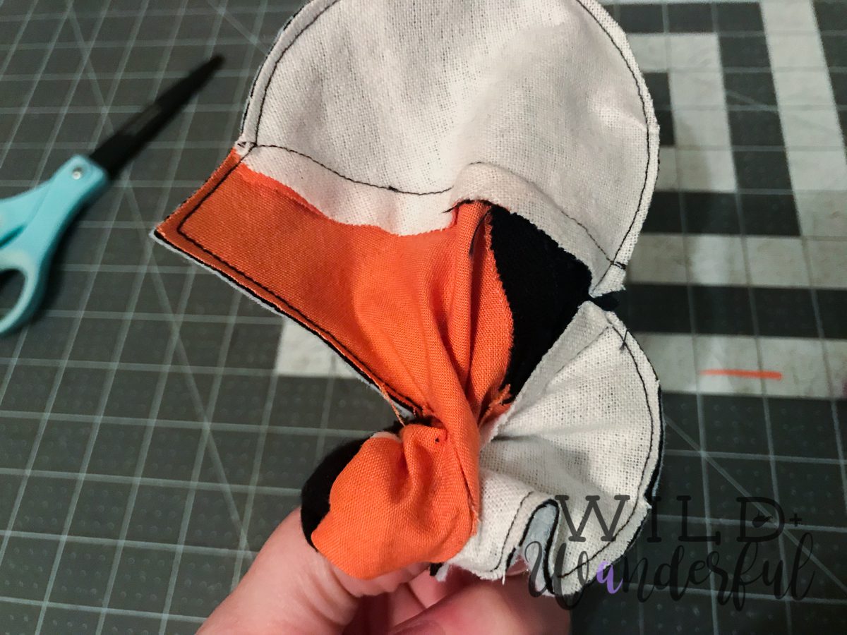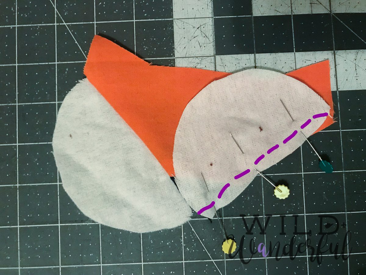 Step 5: Right sides together, ease the eye piece onto the face/nose. Pin and sew using 1/2″ seam allowance. Press seams open.