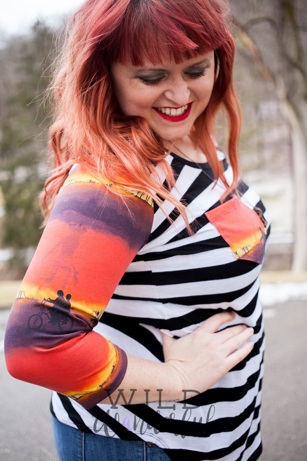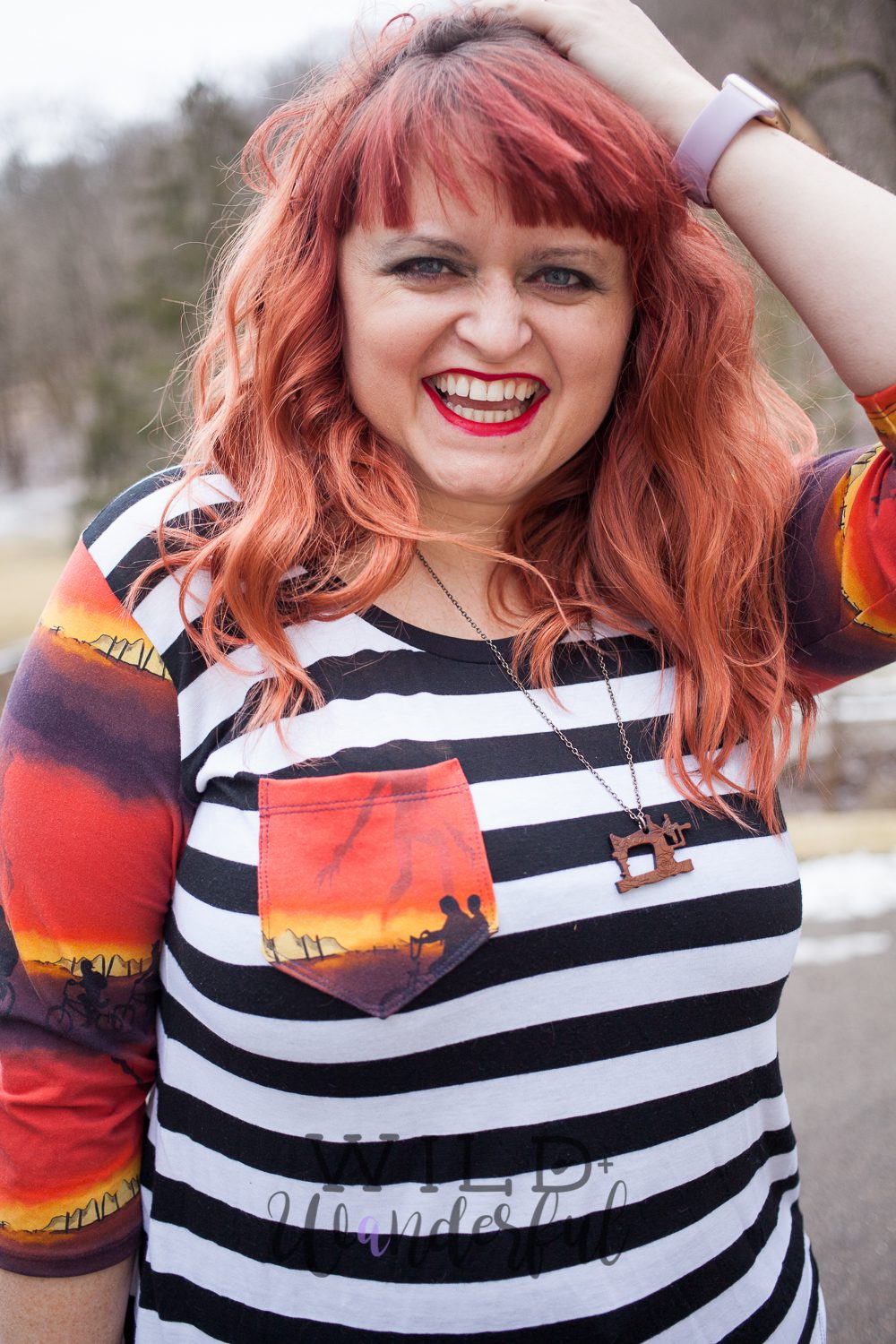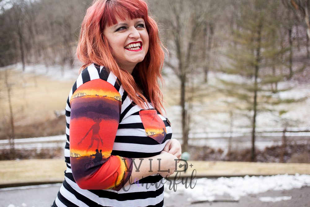 I am not a person who is ever drawn to this color scheme. I tend to shy away from colors that match my hair. However, as a complimentary fabric (and not the main print right next to my face), I can totally get down with this. I love the nod to Dali’s style of art. And I looooooove the Demogorgon’s shadow. Love it. It’s just so cool! I wanted to use every inch of the fabric that I could, so I added that little pocket to the front as well. I think it ties the print nicely into the shirt more too.
