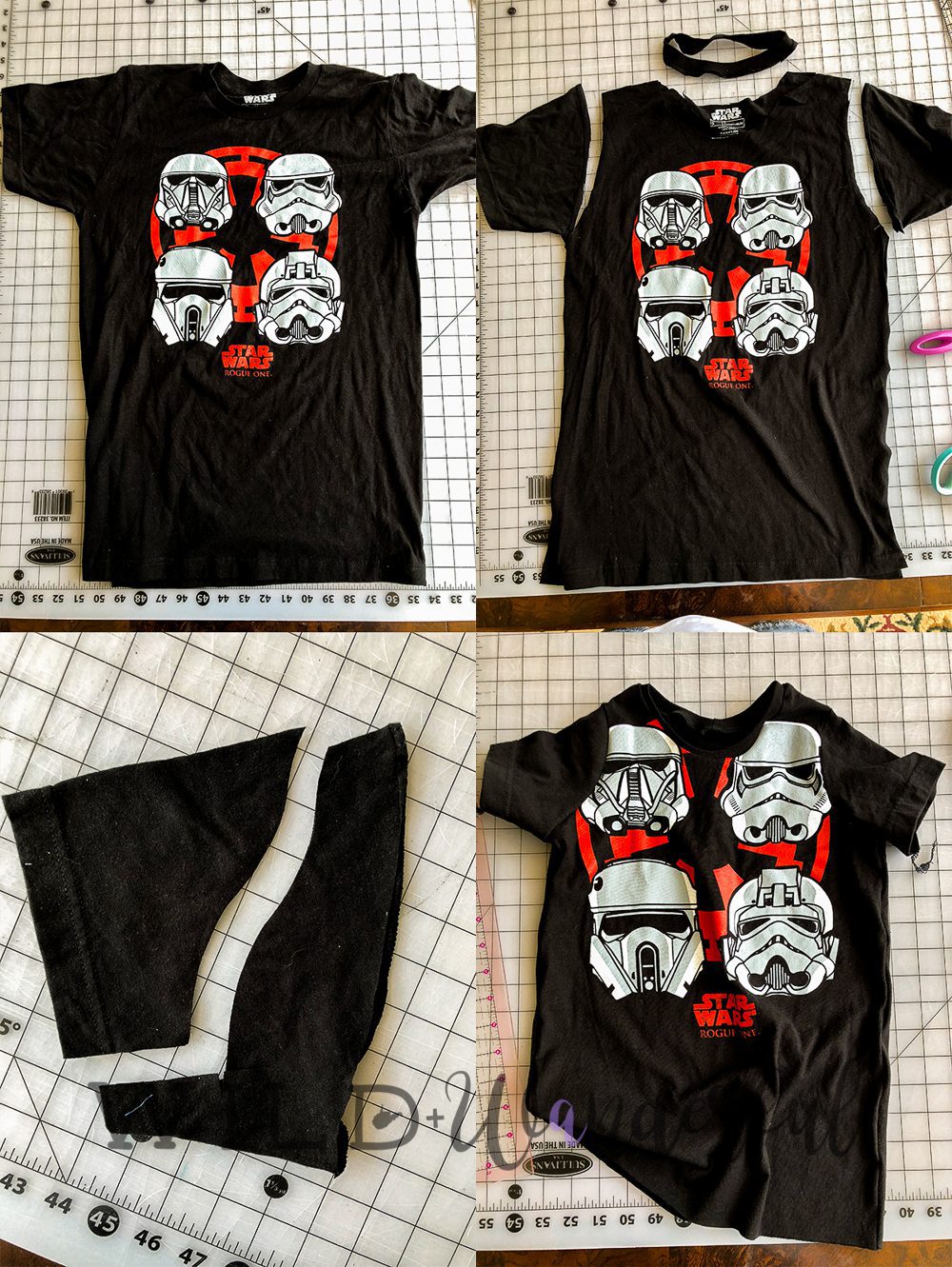 One of my favorite ways to fabric shop is in the clearance racks at Target and the likes. You can find some really great graphic tees for super cheap…much cheaper than getting a panel from somewhere. I usually buy the largest size I can find…aiming mostly for men’s XL shirts or larger. However, this one was a men’s small. And you can see that because of it, the graphic ended up getting cut off in places. No sweat whatsoever, I still love the shirt. But it’s something to take into account when you’re fabric shopping in the clearance racks! I even like to use the sleeve portion, hem included. I just move my pattern piece to remove the hem allowance for that part. Saves one extra step in sewing!