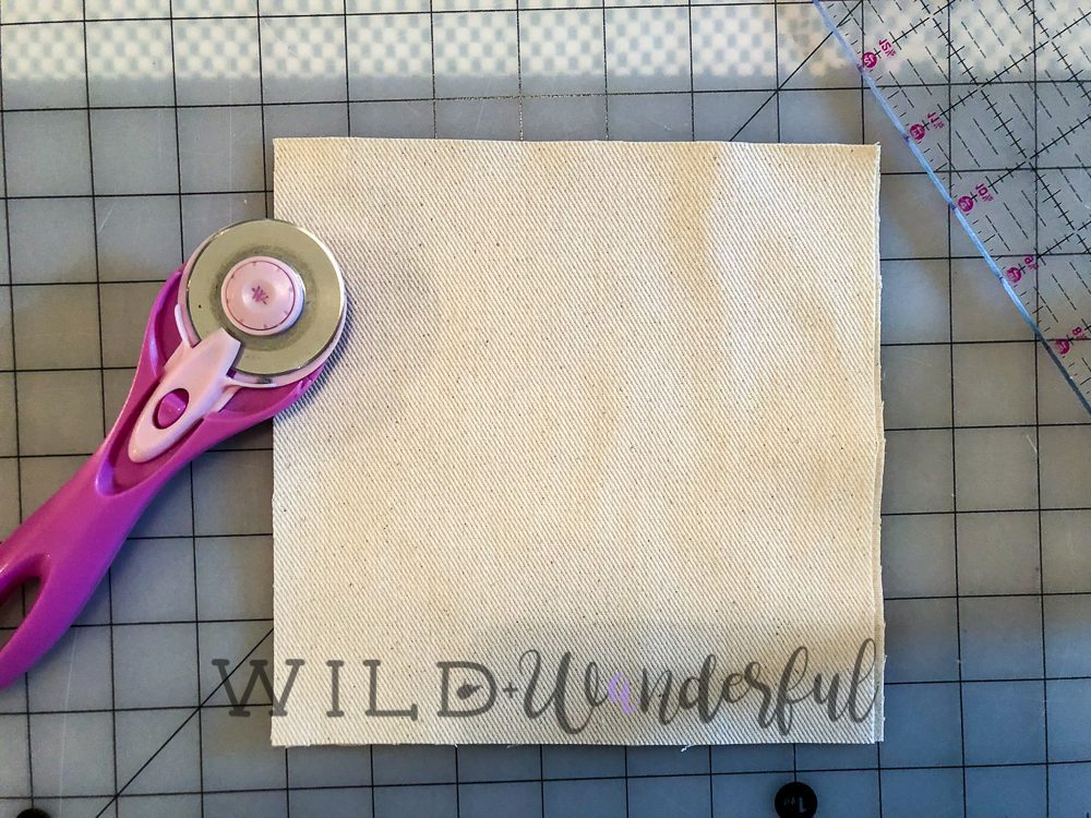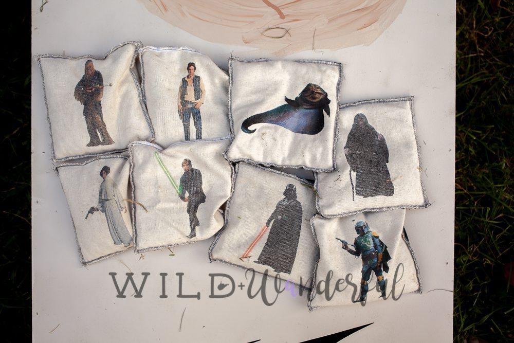 We wanted to make some bean bags with characters that we could toss into the sarlacc pit. The easiest decision was to make the teams based upon the good guys and the bad guys. I grabbed some oatmeal colored duck cloth and cut them into 7″ x 7″ squares. The regulation sized bean bags for these games are 6″ x 6″….which meant I gave myself 1/2″ on each side for seam allowances. Easy peasy!