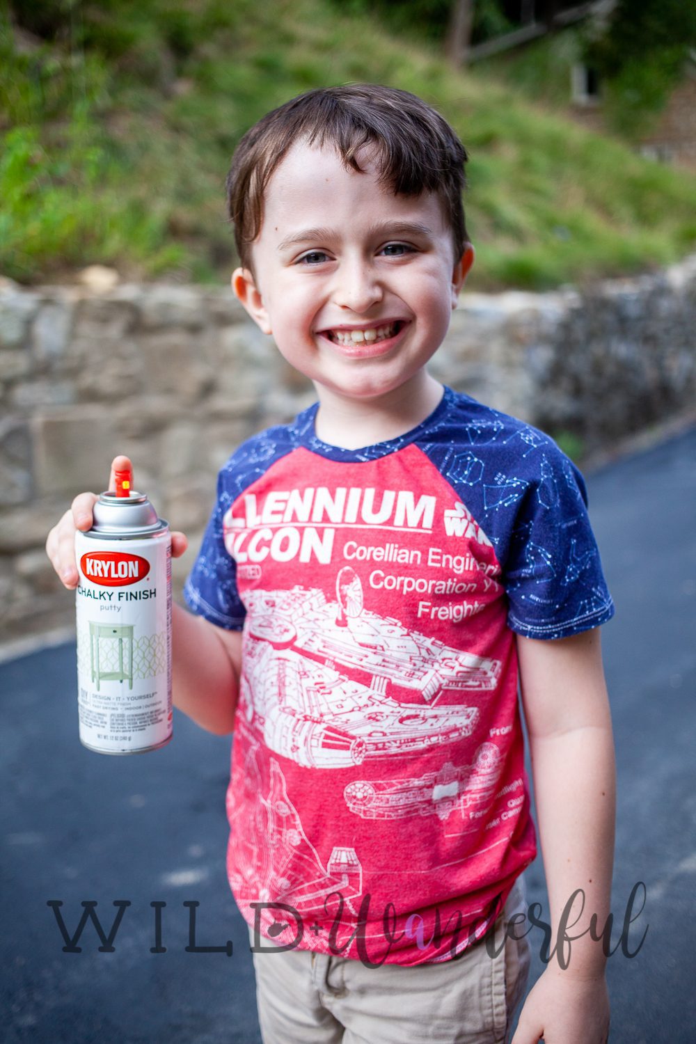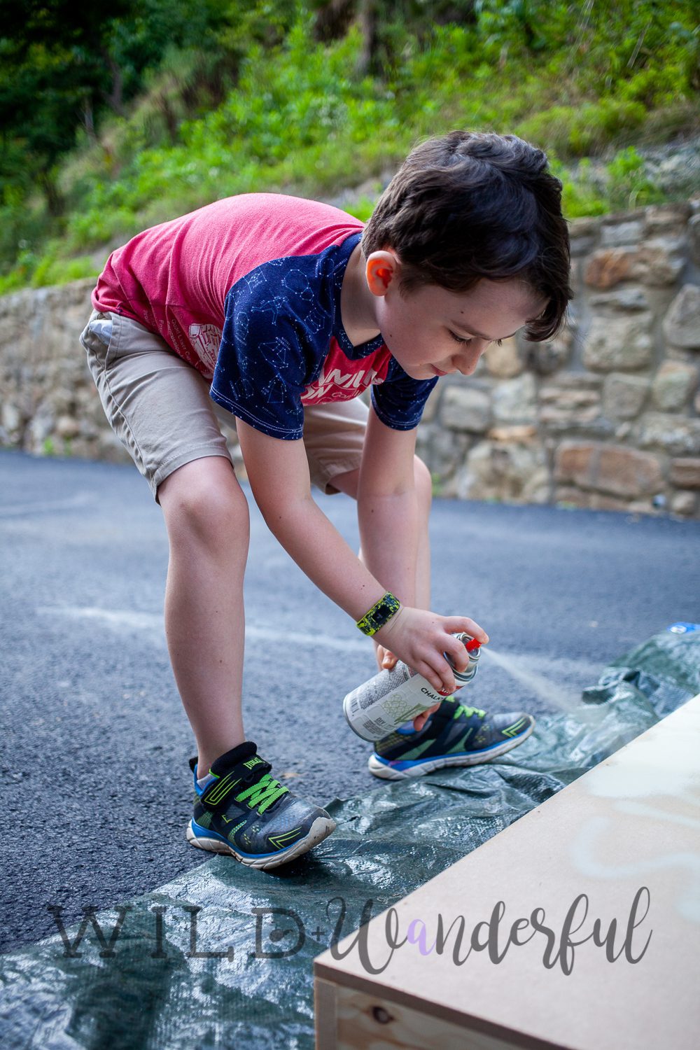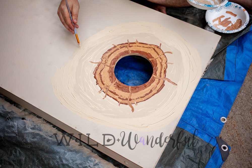 Louis was super excited to be in on the spray painting element of this project. We grabbed a “sand” colored paint and coated the entire board in it for our base color.