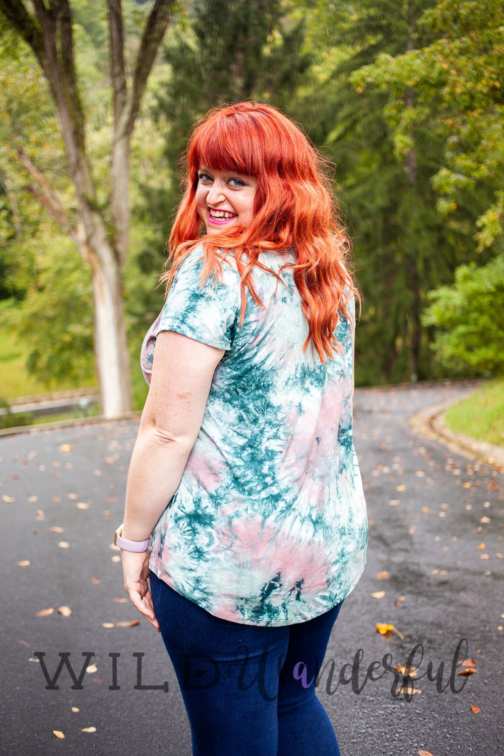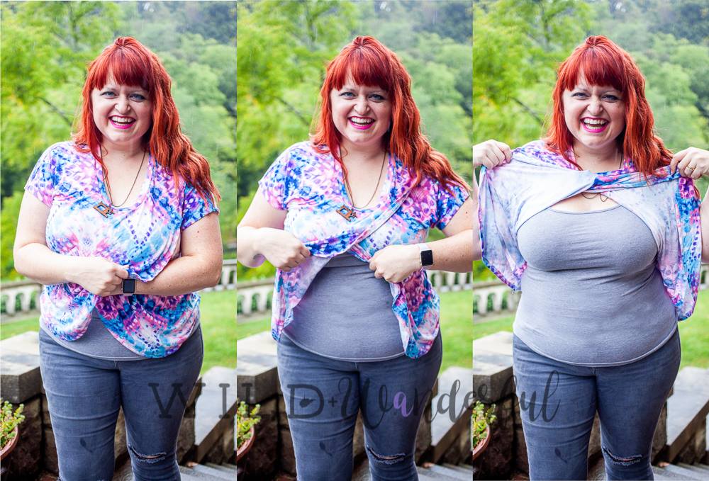 Let’s start the sharing, shall we? First up is the “tulip front” version. Which also happens to be made using the July Threads of the Month fabric! I don’t know what took me to long to decide what to make out of this fabric, but it did. I think I loved it too much that the decision on what to cut it into was killing me. It’s a rayon/spandex blend is just perfect for this pattern. The Tulip Tee is designed to be a loose and flowy dolman, and this drapey fabric was an excellent pairing with it.