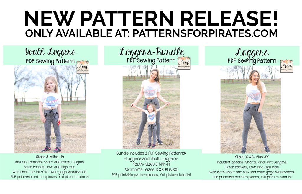 What exactly is a logger? It’s what you would get if leggings and joggers had a baby. Seriously. They wear like a jogger, but have the look of leggings. And they have a lot less specific fabric requirements compared to a legging pattern like the Peg Legs, in that they only need 40-50% horizontal stretch and at least *some* vertical stretch.