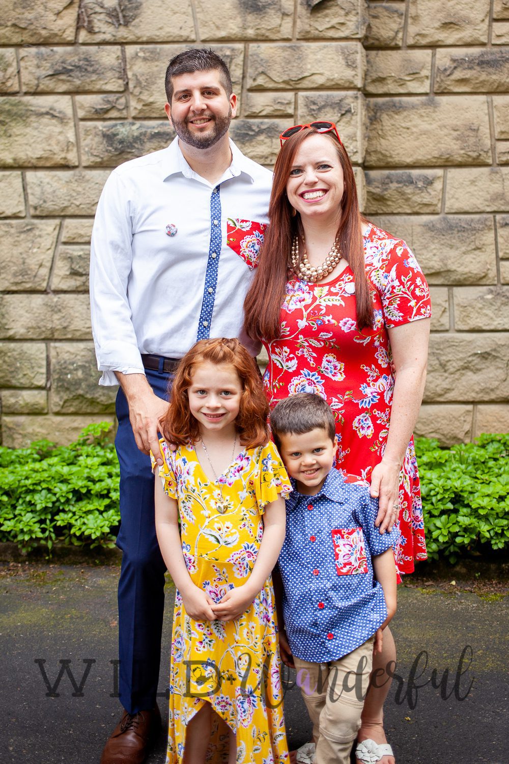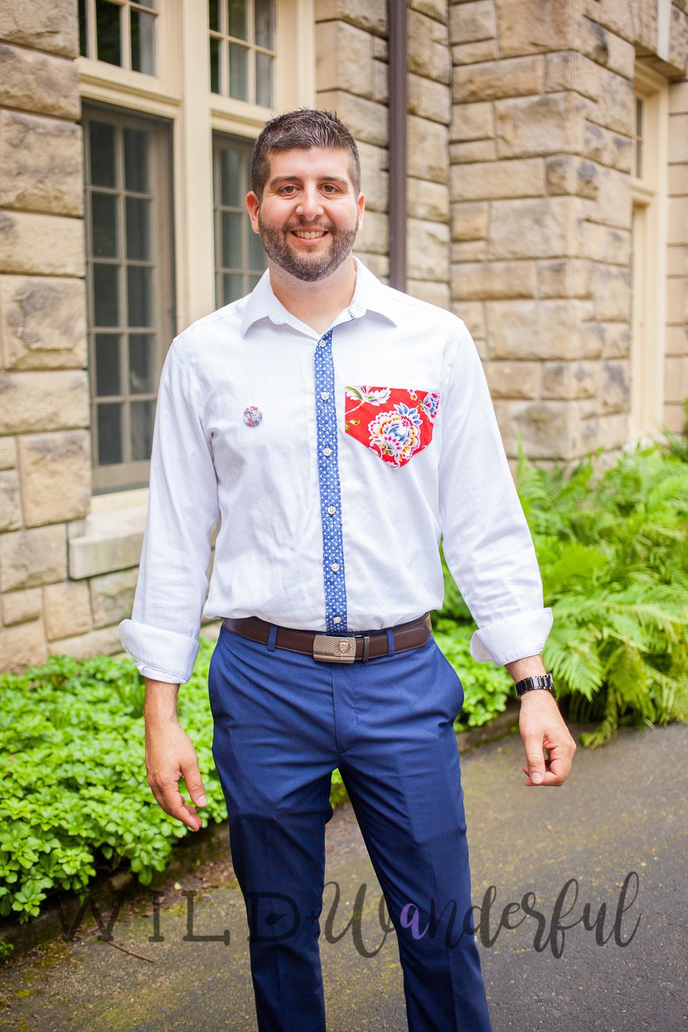 I wanted to tie his colors into what I’d made for the girls, so I grabbed scraps from his mom’s fabric, added a little interfacing to them, and made them into contrasting details on his shirt. I was adorable on him! Lincoln was another person we failed to get individual shots of, which bums me out, but we did get a bunch of group images of him…so that’s something, right?