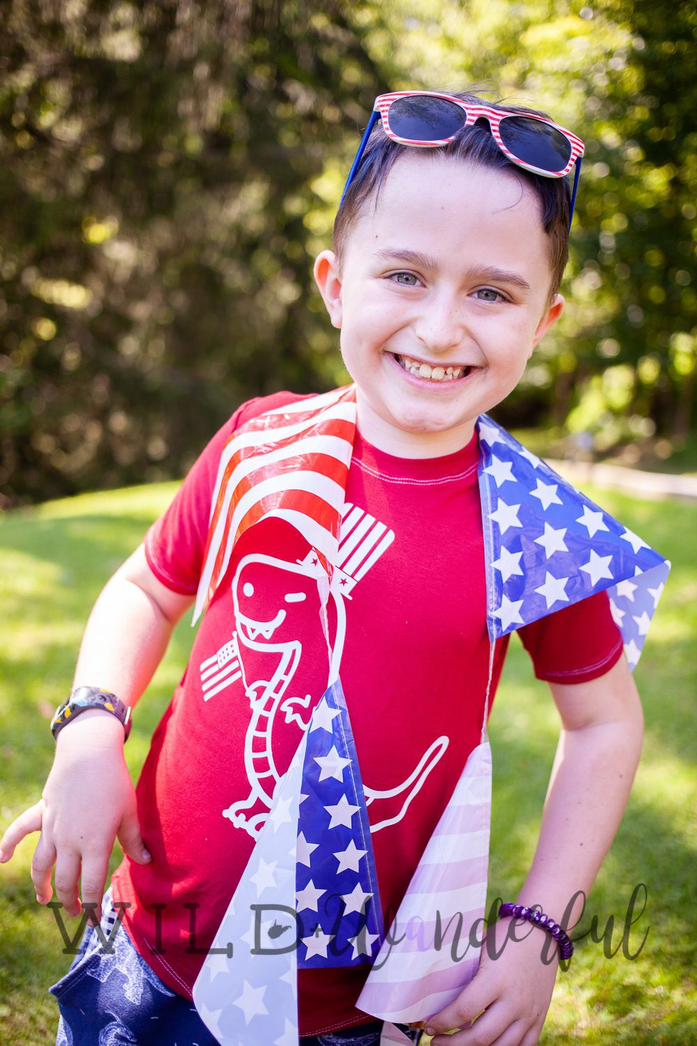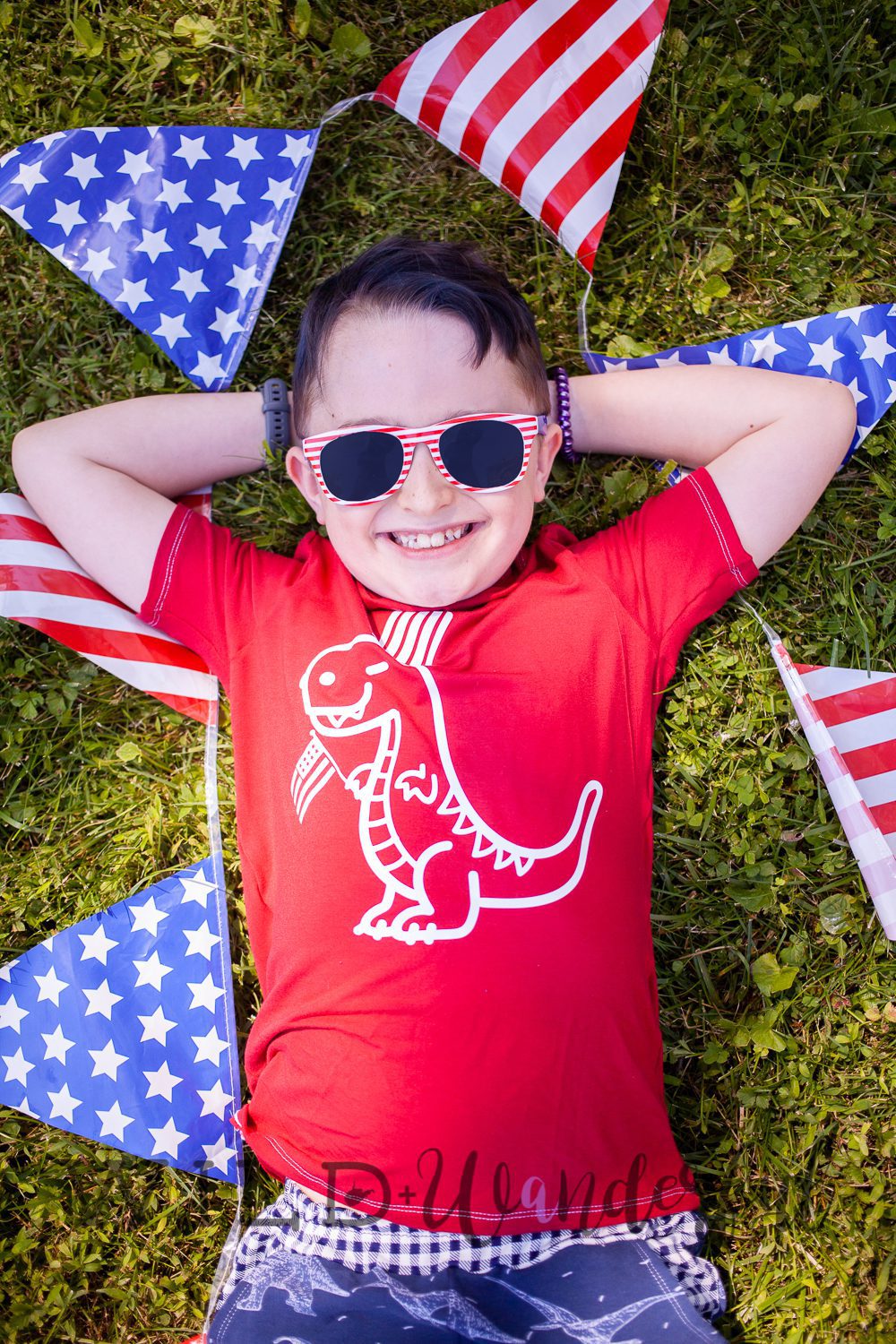 But how do you make dinosaurs into an Americana look? By creating an American Dino, of course! I designed up this cute flag waving, Uncle Sam hat wearing TRex…and then slapped it on a shirt for him!