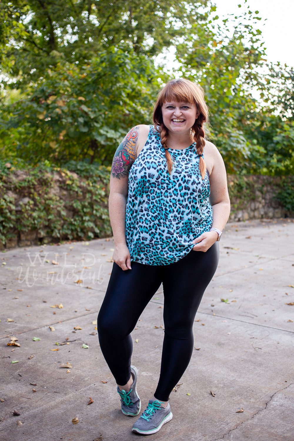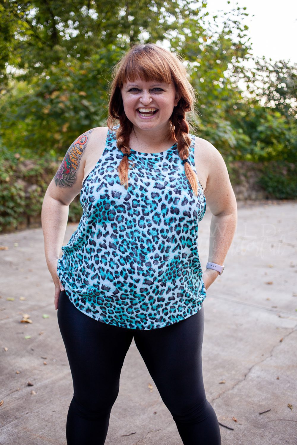 For the tank, I used a rayon/spandex blend that I received in a mystery box from Boho Fabrics. I purchased their animal print box and was NOT disappointed. (You can actually see an unboxing video on my Insta channel here!) I think teal is my second favorite color obsession…obviously it takes a back seat to purple for me, but I find myself gravitating to it a lot. So having a teal leopard print was so amazing. I adore it.