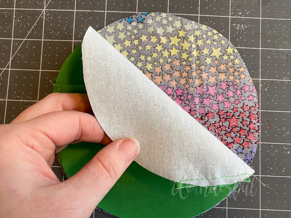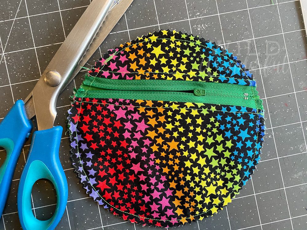 • Carefully trim excess fabric.  I recommend using pinking shears, to give you a smoother circle.