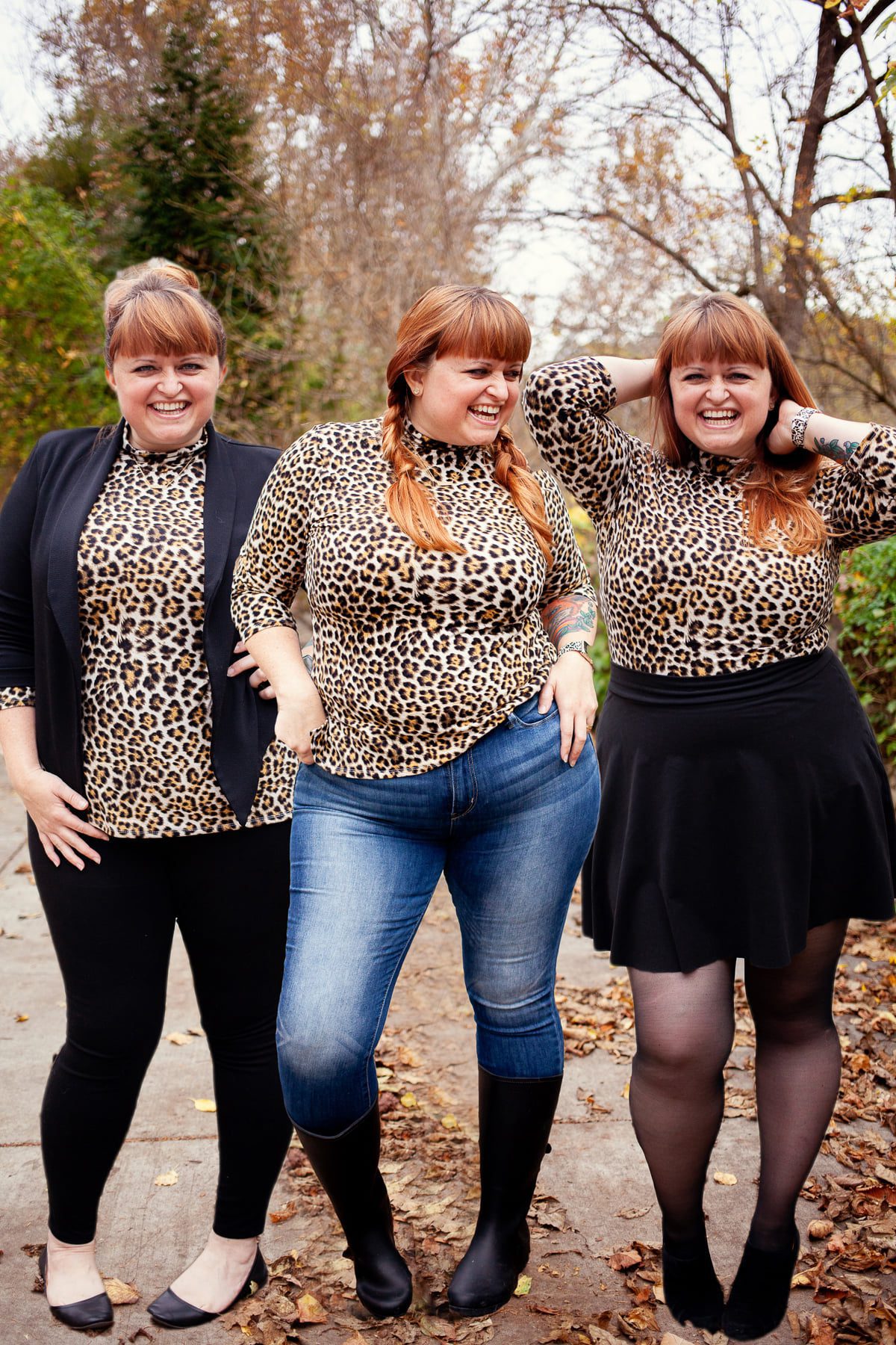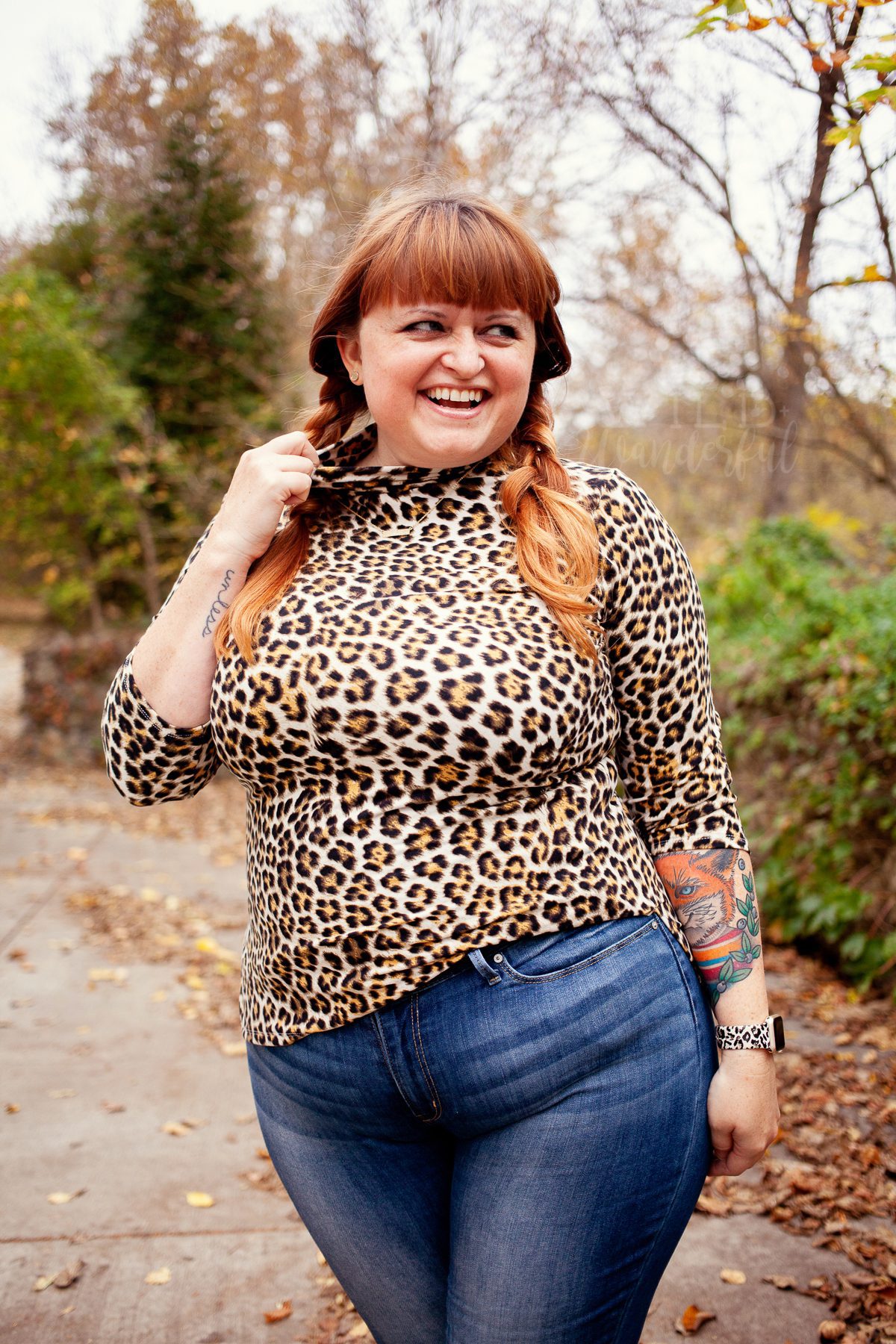 I used the Hepburn Top + Dress pattern, and made the turtle neck, 3/4 length sleeve, top length version. Normally I’m not a gal who likes to wear higher necklines, but this leopard print really sang to me and it needed to happen. NEEDED to, y’all!