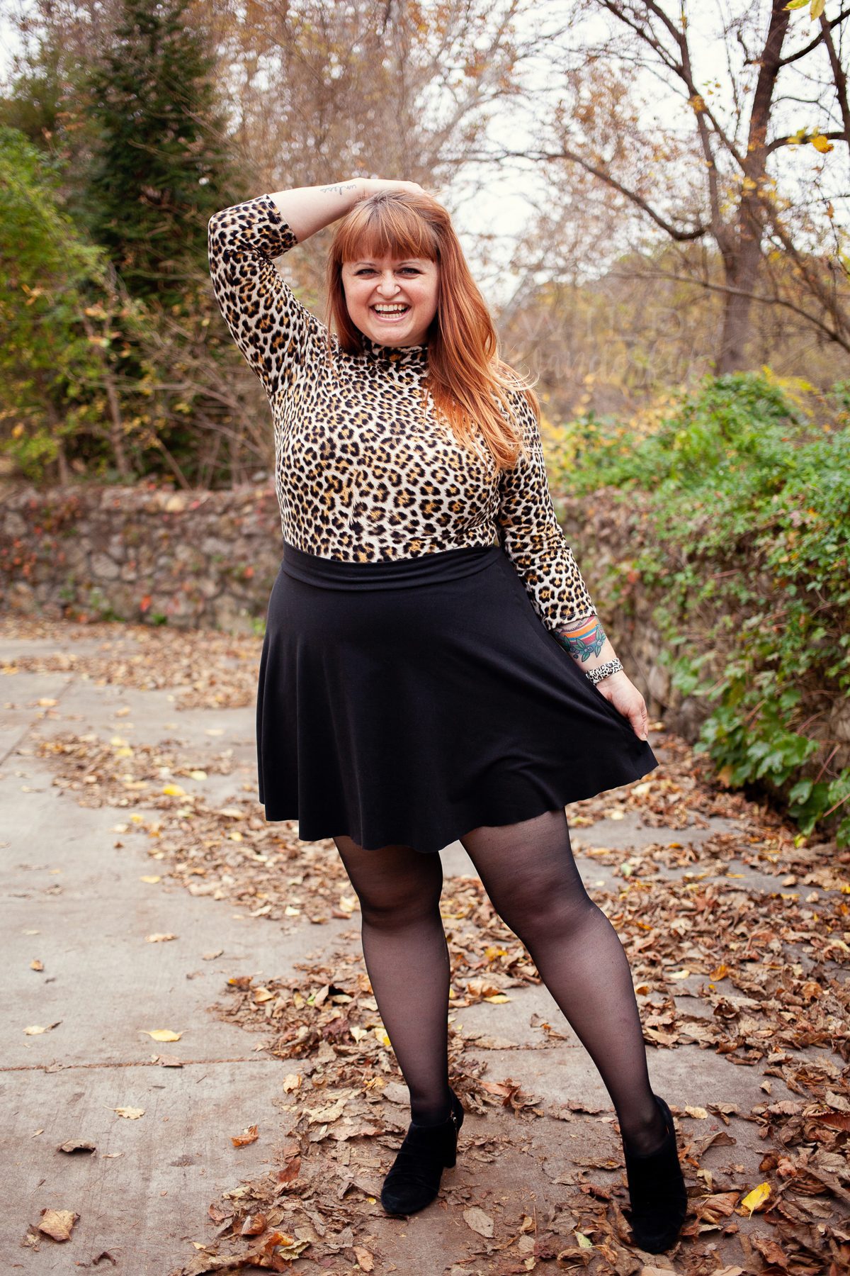 I used the Hepburn Top + Dress pattern, and made the turtle neck, 3/4 length sleeve, top length version. Normally I’m not a gal who likes to wear higher necklines, but this leopard print really sang to me and it needed to happen. NEEDED to, y’all!