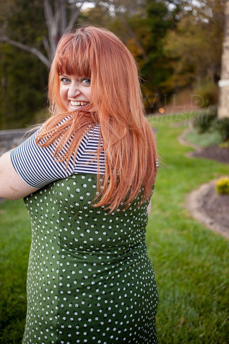 I told you that this pattern can be used for more than just team wear, didn’t I?  Here’s your proof!  I took one of my favorite ditzy florals (in this cute autumn color scheme) and paired it with some of my beloved black + white stripes…and I’ve got a really sweet, casual dress for myself now.  Tshirt dresses are basically the best thing that have ever existed, so this Go Team Dress falls into that category.