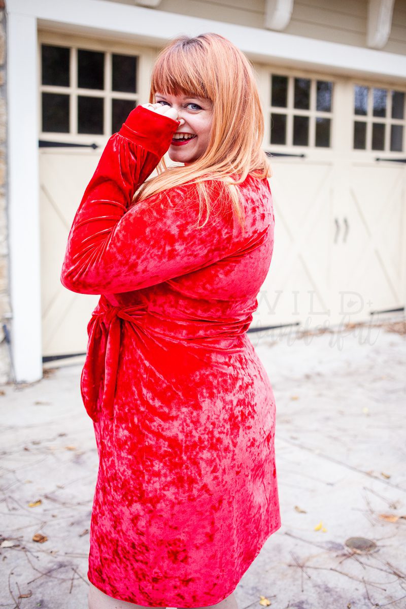 My first version of the Katy (whoop whoop!) pattern was in a dress length, as made obvious by the cover photo and these images I’m sharing right now, haha. I had this vision for the perfect holiday dress and rushed to the store to find some crushed velvet. I pretend to not like crushed velvet…and yet some of my favorite dresses are made with it. So, there’s that.