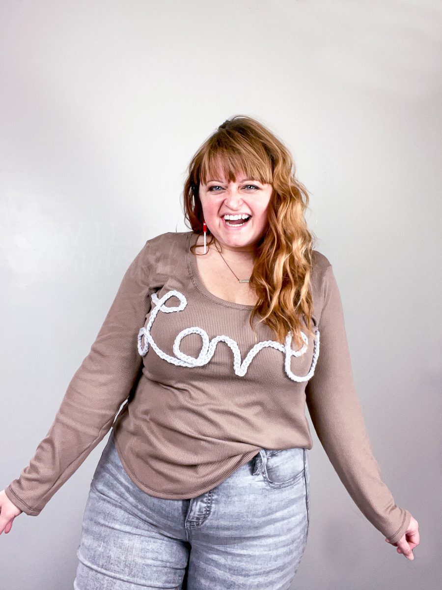 I’ve been seeing sweaters like this pop up in my feed recently. Mostly they’re little girl’s sweaters with their names stitched onto them. So obviously this full grown adult needed a copycat version — but I opted for not using my name. HOWEVER. Figuring out a single word that I was capable of creating out of chain stitched yarn was much harder than I thought it would be.