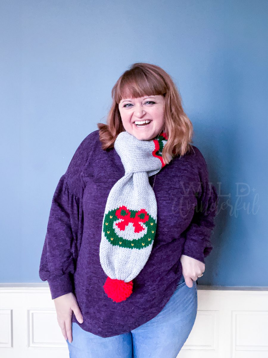 It is a cuffed scarf. Meaning if you’re like me and terrible at wearing scarves because you don’t really know how to tie them and make them look cute…I’ve got you. This scarf has a loop / cuff that lets you slide the one end into it and wear it around your neck with ease. It’s THE CUTEST!
