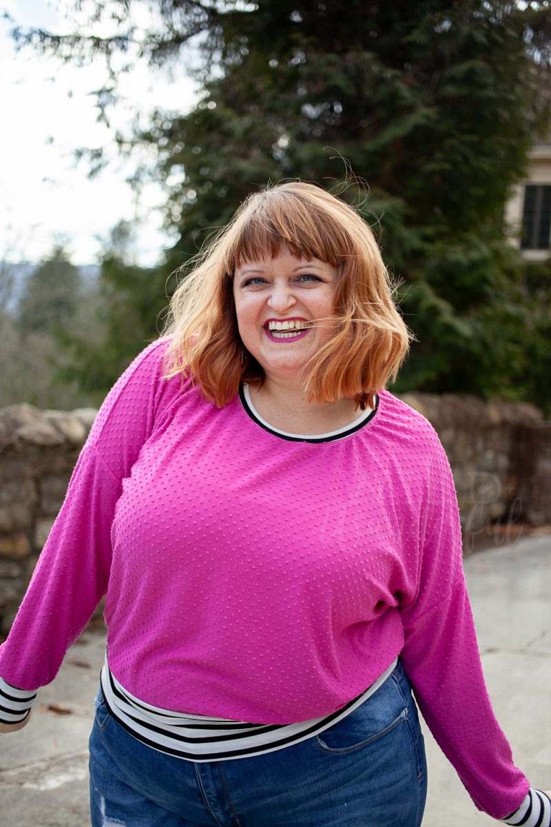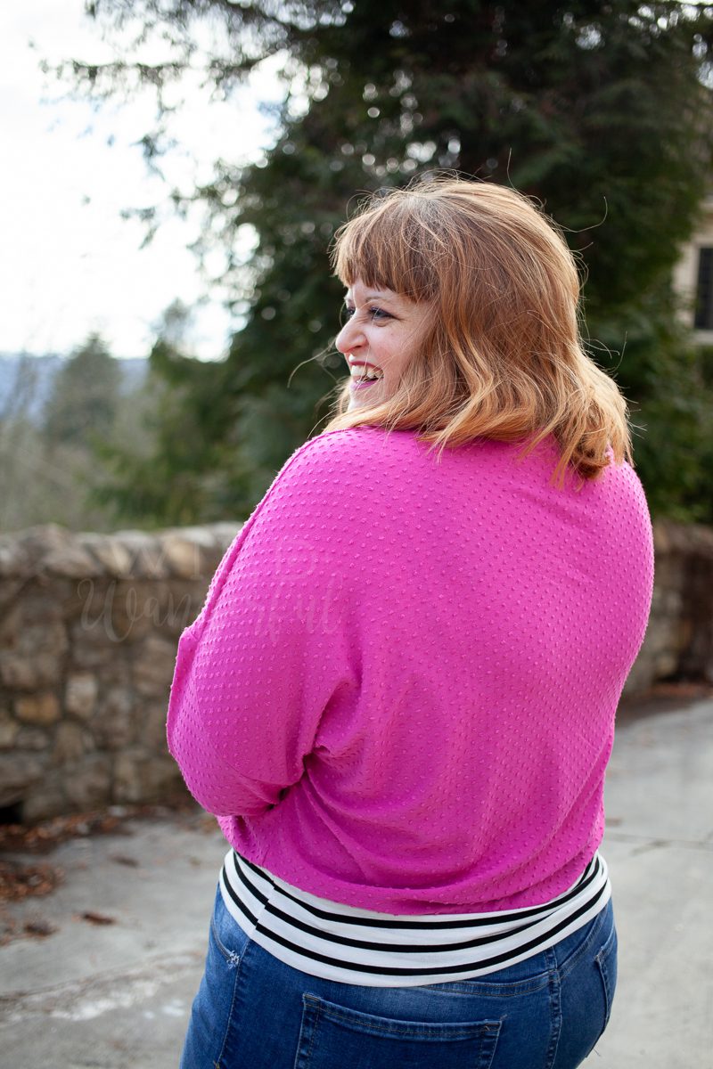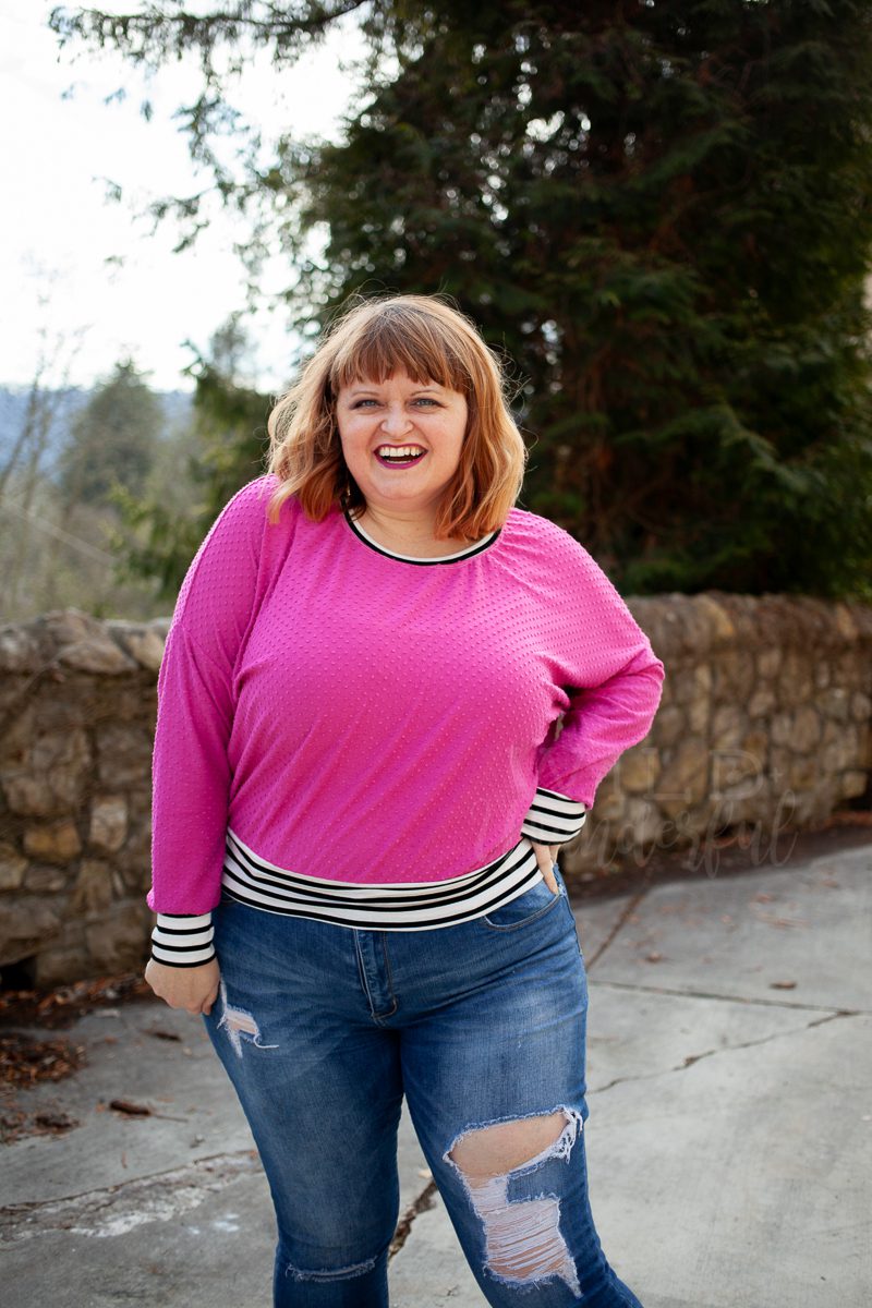 I really feel like I hit my “Barbie Core” stride with this top. I used a black + white stripe mystery knit (one of those rando ones you find in the deal section of Walmart bins) for all of the bands, and I think it really was such a fun decision to make. I adore the contrast of black + white against this gorgeous vibrant pink, don’t you?