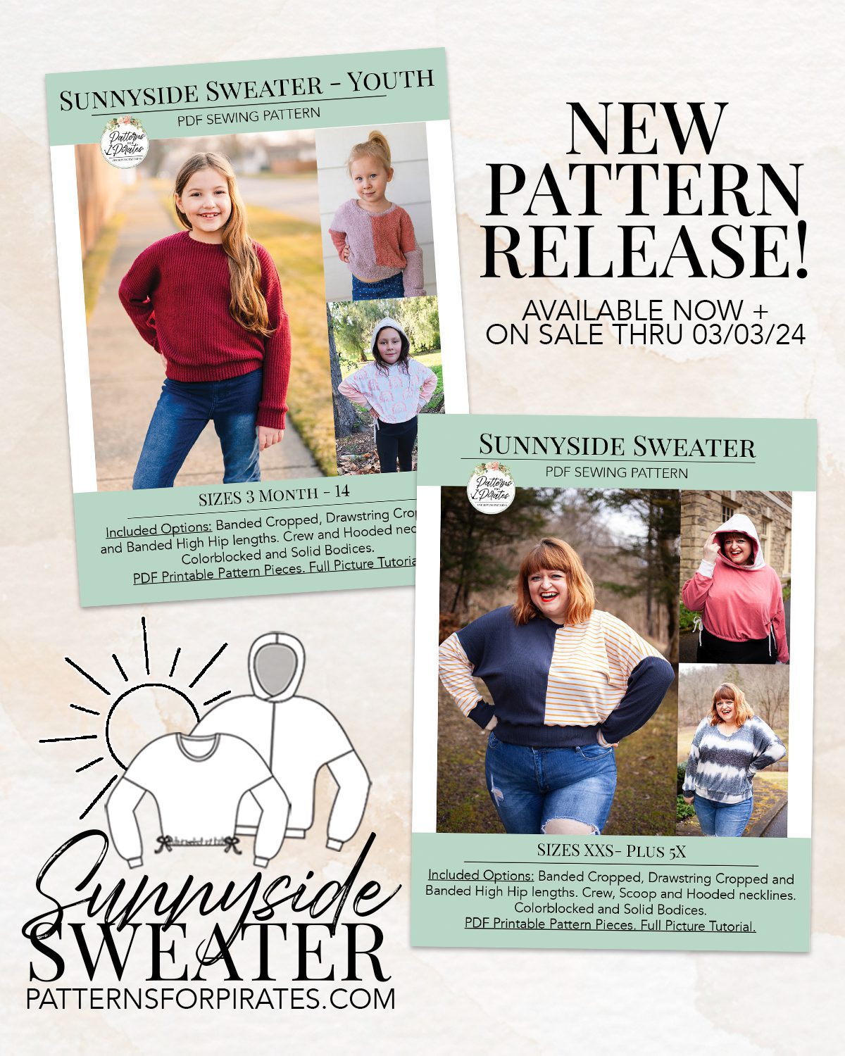 I’m beyond thrilled to introduce the two newest patterns that were designed by yours truly: Sunnyside Sweaters (in both Youth + Adult sizes).