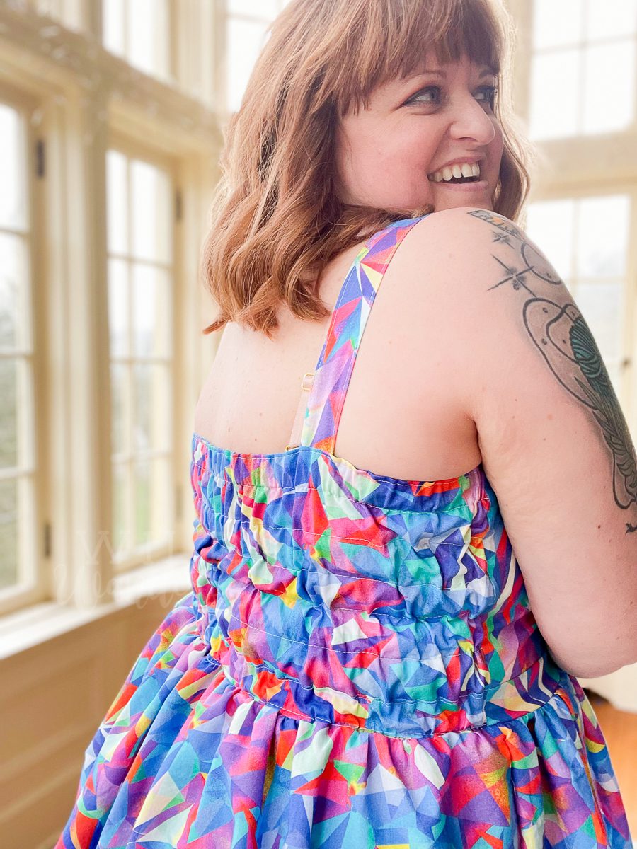 Isn’t the back bodice so clever? It’s like shirring without having to do the actual shirring. I didn’t even have the correct width elastic, much less the right amount of it, so I went off-pattern a bit and winged it with my elastic casing method. I think I made a total of 7 casings but only had enough elastic to fill 4 of them. It still worked! And I love the fit and feel of it!.