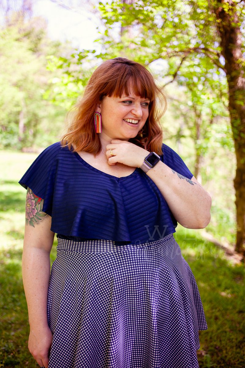 Tis the season of Katy wearing dresses and skirts as much as possible. I’m particularly smitten with wearing circle skirts, as can be made evident by the bajillion I have in my dresser. What I like is having a top that can go with said circle skirts. I decided to make this month’s fabric into a Francis Flounce, because I LOVE this pattern and it fit into my need of making something with a flounce or ruffle.