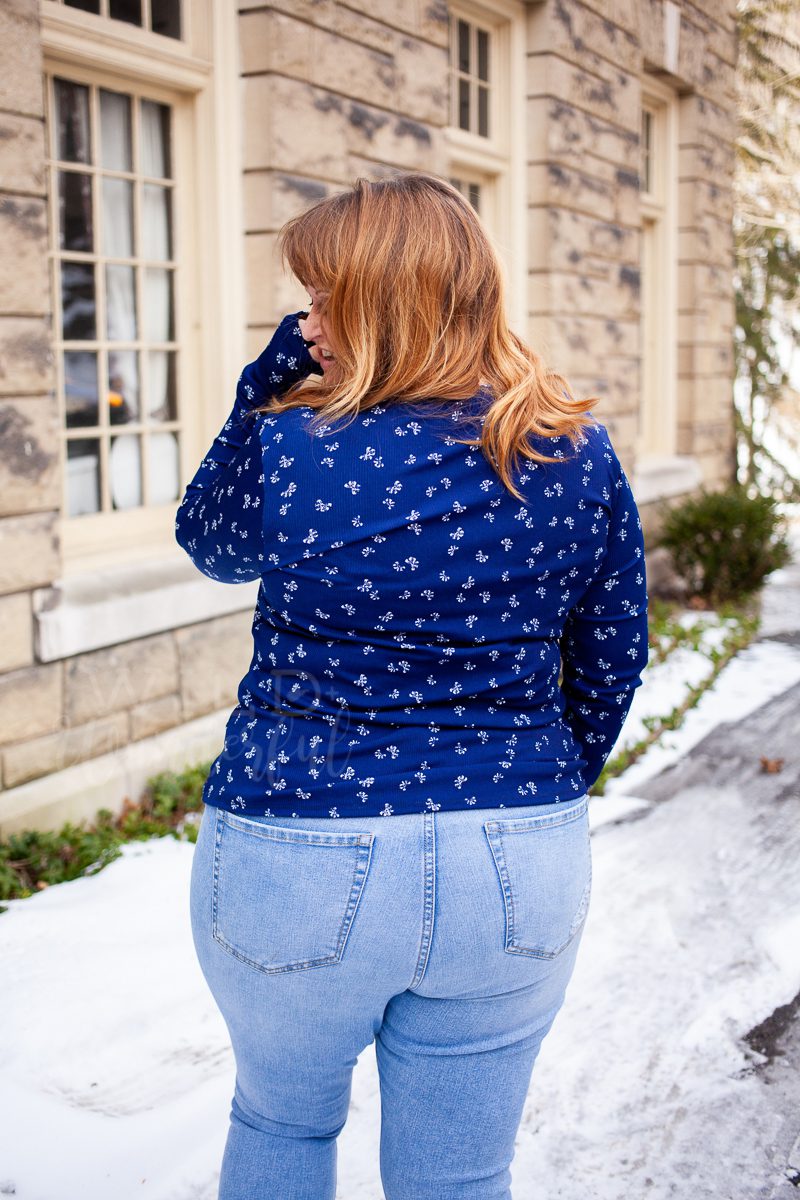 Bows are super on trend right now, and we were super excited to have found this sweet print when we were searching for January’s shipment. I love that it’s more subtle than some prints, but it’s almost like those ditzy florals that I love so much. Plus, being on a navy base is a huge bonus for me. I always love how this color looks against my coloring…and yet somehow I barely have any navy in my closet. I seriously need to seek more out.