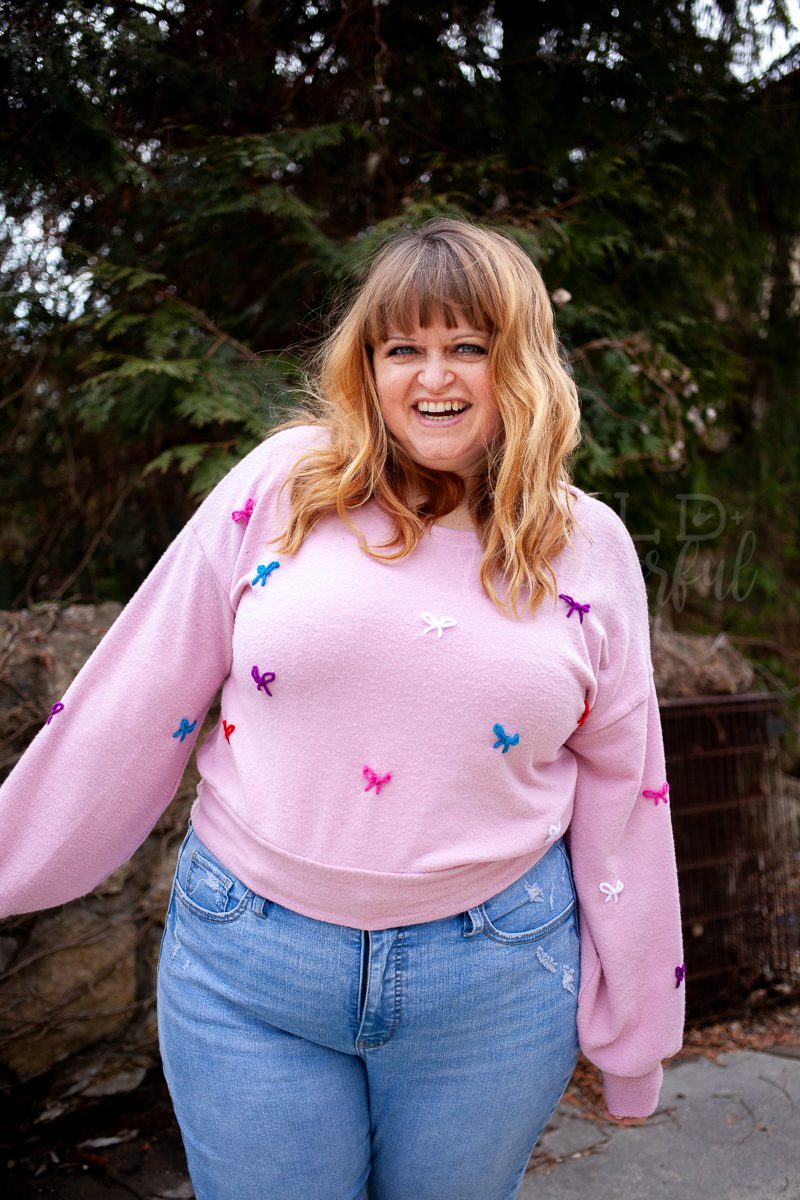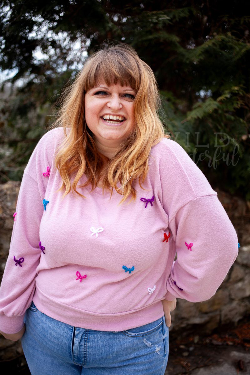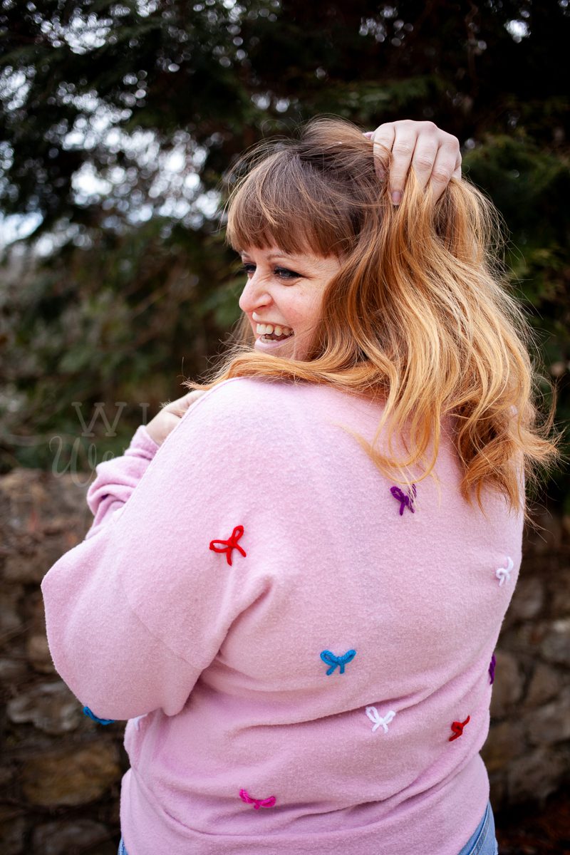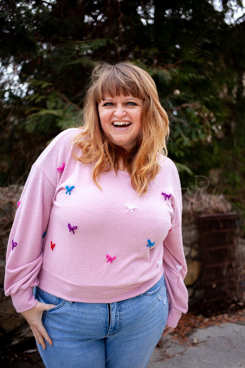I thought it would be SO FUN to embroider little bows all over this sweater knit that we delivered to the Fabric for Pirates subscribers. Apparently I’m back on my bullshit of not being able to just leave a solid fabric alone, and I needed to add something to it. Instead of sublimation or HTV, apparently my new thing is yarn.
